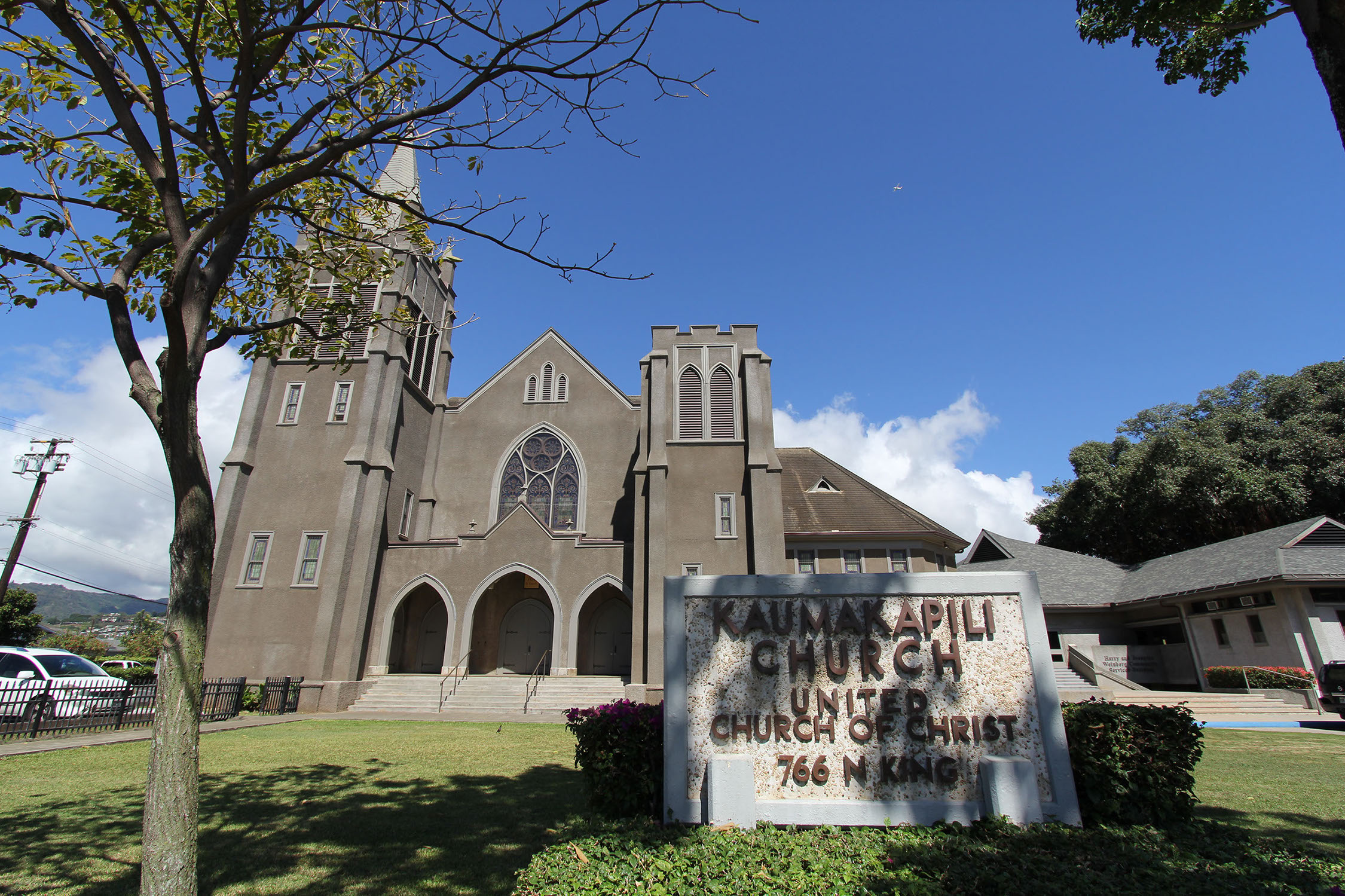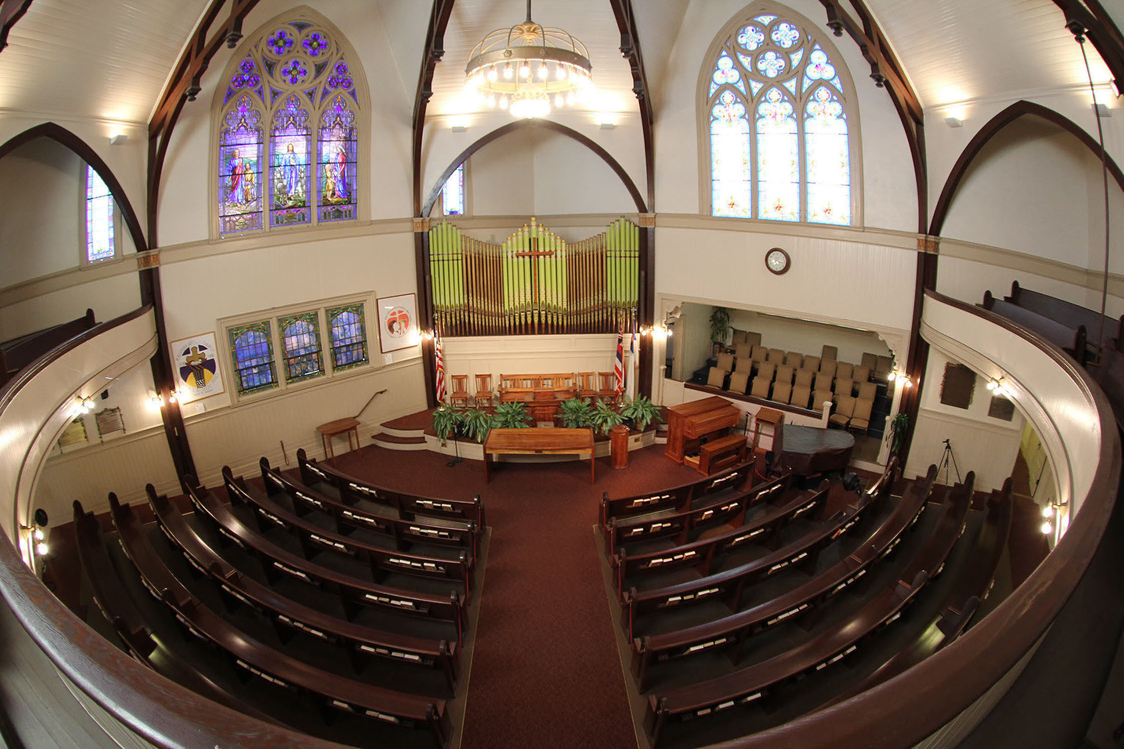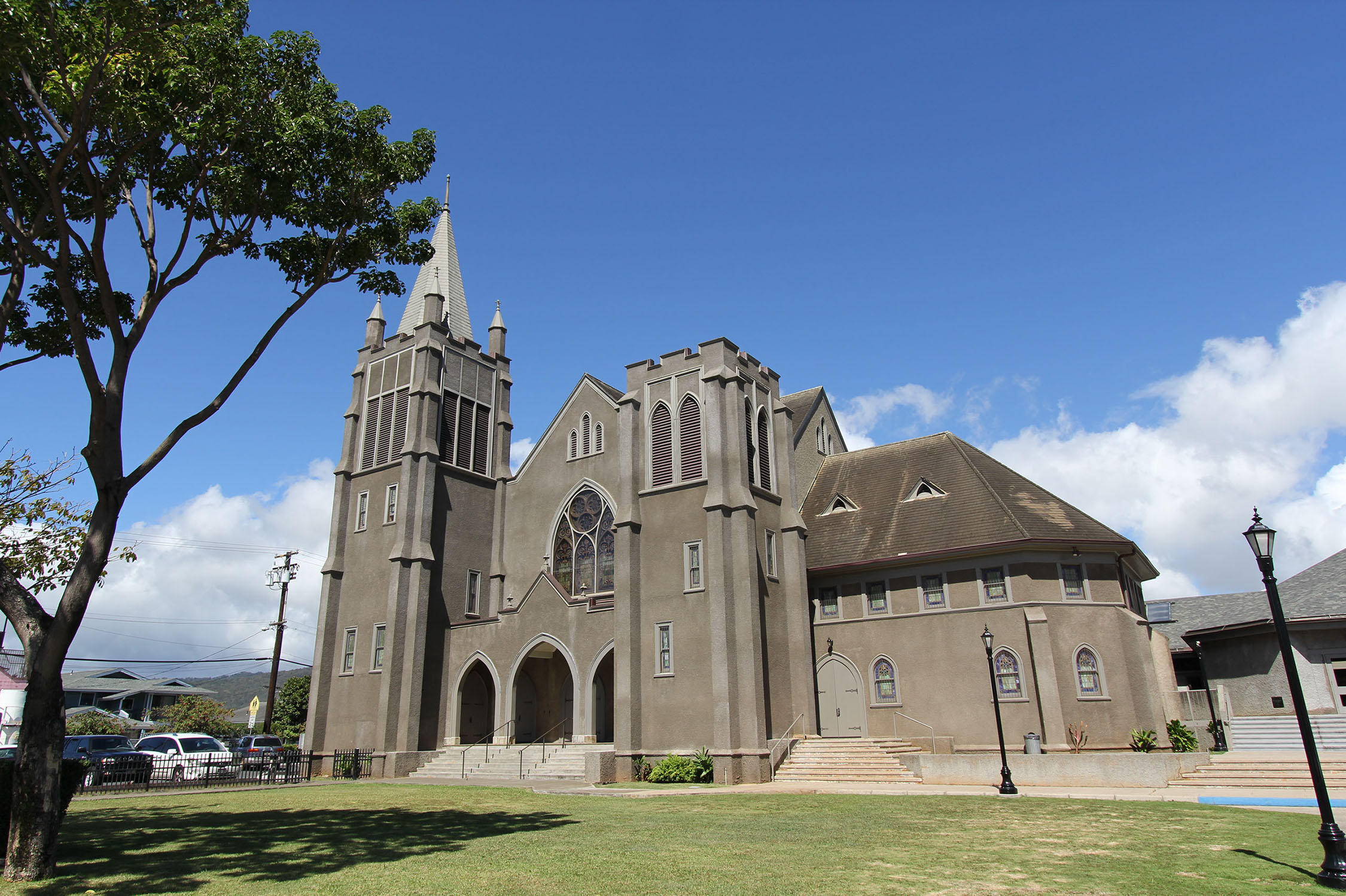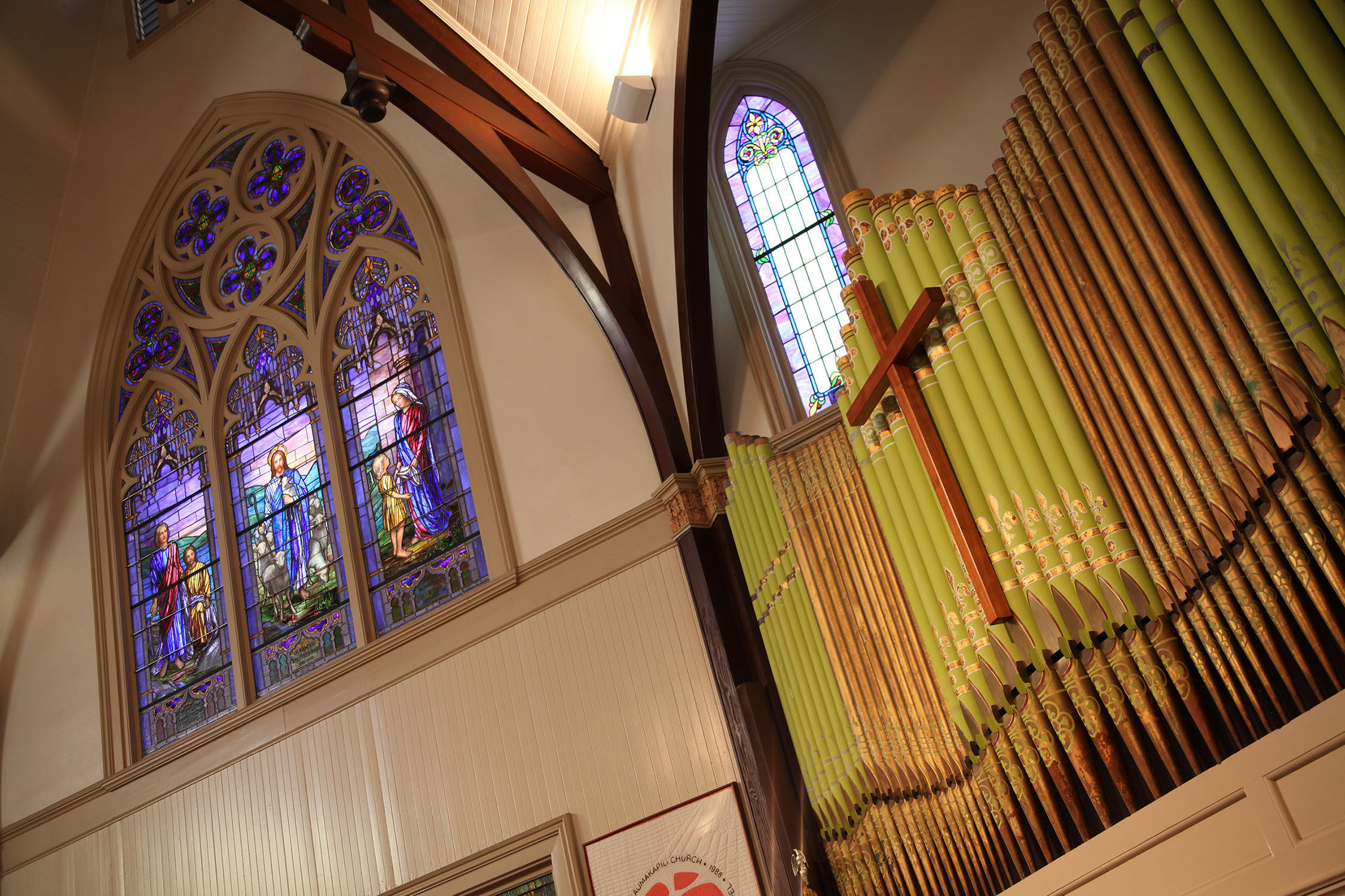 1838年ハワイアンのために設立された歴史ある教会です。聖書をモチーフにした鮮やかなブルー基調のステンドグラスとグリーンとゴールドのパイプオルガンが特徴です。